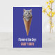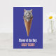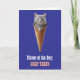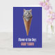 Ein graues Tabby-Kätzchen klebt aus einer Eistüte.