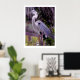 Dieses Poster ist ein Foto eines großen blauen Helden, stehend vom Wasser. Der große blaue Held ist ein großer Vogel mit langen, dünnen Beinen und einem Hals, der wie der Buchstabe S geformt ist. Das Foto zeigt fast den ganzen Körper des Vogels, dessen Federn im Schwanz in dunkelbläulichen Grautönen gehalten sind, bis zu einem hellgrauen am Hals, auf beiden Seiten schwarze Federn. Auf dem Kopf des Helden befinden sich zwei dunkelblaue Bänder mit Weiß zwischen und unten. Der Held sieht uns mit seinen gelben Augen hinter einem langen Schnabel an. Im Hintergrund sind tropische Grüntöne und getrocknete Blätter aus Palmen, die die Formen des langen Absturzes des Vogels widerspiegeln.