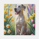 Ein fröhlicher Hund sitzt friedlich auf üppig grünem Gras, umgeben von bunten Frühlingsblüten unter einem weichen blauen Himmel. Dieses digitale Ölgemälde erfasst einen ruhigen Moment mit ausdrucksvollen Pinselstrichen, warmen Farben und einem Gefühl sanfter Freude.