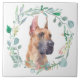 Ein Aquarellporträt eines schönen Großen Tanzes in einem blau-grünen Blattkranz ist das Merkmal dieser dekorativen und nützlichen Kachel. Perfekt für jeden, der einen Dänen Liebe.