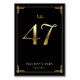 Große Gatsby Art Déco Hochzeitskarten mit goldener Nummer 47 und variierbarer Tischnummer, wo Sie Ihre Namen und Ihr Hochzeitsdatum hinzufügen können, auf schwarzem Hintergrund gedruckt