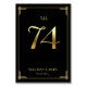 Great Gatsby Art Deco Hochzeitskarten mit goldener Nummer 74 und variierbarer Tischnummer, wo Sie Ihre Namen und das Hochzeitsdatum hinzufügen können, auf schwarzem Hintergrund gedruckt