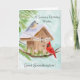 This hand-painted watercolor features a charming birdhouse adorned with a Happy Birthday banner, as a tufted titmouse and a cardinal stop by on a crisp January winter day. Soft seasonal details and gentle colors create a warm, thoughtful scene, making it a lovely birthday piece for great granddaughter who celebrates in January.