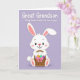 This card features a stylized white bunny with soft-edged ears, one slightly tilted, and rosy cheek accents that give it a sweet, friendly look 🐰. Its wide dark eyes and small pink nose sit above a gentle smile, suggesting a caring, close bond, like it’s happily bringing a treat to someone special. The bunny holds a woven basket with lightly hinted texture, and a bright pink bow tied neatly at the front adds a tender, gift-like touch. Inside the basket are glossy egg-shaped treats in orange, green, blue, and purple, each shaded to look shiny and rounded. The background is a smooth, soft lavender field that keeps the focus on the bunny and the basket while adding a calm springtime mood 🌷. Near the top, the words “Great Grandson” appear in white, rounded lettering, with a smaller white line beneath that reads, “A big Easter basket of love to you.” Small details like the fluffy white tail and the pink pads on the bunny’s feet are visible near the bottom of the design.