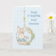 Es ist das allererste Ostern deines Urenkelns. Diese Karte wird mit ihm und seinen Eltern feiern. Ein süßer Hase sitzt auf einem Blumenkranz mit kariertem, zartem, weichblauem Hintergrund.