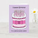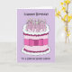 Ein riesiger, rosa und weißer Geburtstagskuchen, der mit hellen Kerzen bedeckt ist. Der Kuchen ist Set vor mauvem Hintergrund und wird von den Worten "Happy Birthday to a special great niece" begleitet.