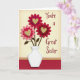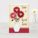 This card shows three stylized flowers rising from a simple white vase on the left side. Two flowers are deep red and magenta, and the third is a softer pink, each with a small golden heart at the center that looks like textured fabric. The stems are thin and dark brown with a few small leaves, giving the arrangement a sweet, tidy look. The background is a creamy beige, so the flowers stand out without feeling busy. Along the bottom, a wide burgundy strip runs across the card, with a thin gold ribbon line just above it. On the right, the words “You’re a Great Sister” appear in a handwritten-style letter look in deep red, placed about mid-height and easy to read. It feels meaningful because it’s simple and affectionate, like a quiet way to say “I care about you” ❤️.