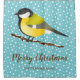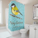 Dieser blau personalisierbare Weihnachtsduschvorhang zeigt Desteis originelle Cartoon-Illustration eines niedlichen Großen Tit / Parus Major Vogels. Der Vogel ist gelb und schwarz. Die Hintergrundfarbe ist blau mit einem Muster von weißem Schnee. Unter dem Vogel steht "Frohe Weihnachten" in Braun und es gibt auch einen personalisierbaren Textbereich für einen Familiennamen, zum Beispiel.