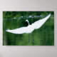 Ein wunderschönes, weißes Egret, das über einen Fluss fliegt, dessen Flügel sich weit ausstrecken.