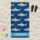 Das coole, personalisierte Badetuch-Design zeichnet sich durch einen marineblau-blauen Hintergrund und ein ozeanisches Muster von grauen, großen, weißen Haie aus. Fügen Sie einen Vor- oder Nachnamen in den modernen Textbereich ein, der mit einem einfachen, hellblau gestreiften Rahmen versehen ist.