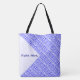 The Greek flag and the word, or name GREECE below in blue, tiled diagonally for an artistic look.. The flag shows blue and white stripes with a blue and white cross in the upper right area. A white, textured space of squiggly squares holds a spot for your name to personalize this tote bag or create a gift. Fun for travelers. Great for celebrating Oxi Day.