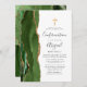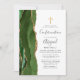 Die links Seite dieses eleganten, modernen Confirmation Einladens besticht durch einen grünen Aquarellstreifen, der mit Imitaten vergoldetem Glitzer bestickt ist. Über dem anpassbaren Text erscheint ein Imitat mit Goldfolienkreuz, das Handschrift, Copperplate und kursivem Schriftart in Holzkohlegrau auf weißem Hintergrund kombiniert. Auf der Rückseite ist ein passendes grün- und goldfarbenes Agatdesign zu sehen.