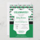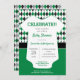 Oversized elegant argyle pattern in school colors of green and black set the backdrop for this cute baby shower design. A white baby bodysuit has all the text written on it for the big event, which can be a couples shower or just for mom. Design comes in maroon and gray, burnt orange and gray, red and black, green and black, orange and navy, green and yellow, and purple and gray. Matching products available.