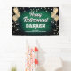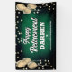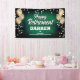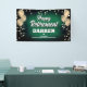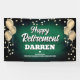 Fun banner sign for indoors or out, featuring festive gold metallic balloons on both sides of the design with sparkly, gold metallic confetti on a rich textured green background for your personalized retirement party banner.