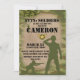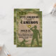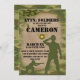 Diese benutzerdefinierte Party Einladung enthält ein Thema für Militärmissionen. Bilder von grünen Armeemandemen werden am unteren Ende des Spielzeugs gedruckt, einer in einem Fallschirm oben. Ein getarntes Muster grenzt an die Bilder.