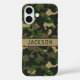 Customize this multi-hued green and brown camouflage iPhone 16 case with your your name in a trendy modern CAP font in brown on khaki. It's masculine and perfect for your favorite military, hunting, country or outdoorsman!