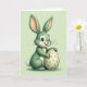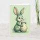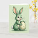 Designed with a soft, springtime look, this illustration features a cartoon-style bunny holding a large egg close, as if guarding it with gentle care 🐰. The bunny has emerald-green fur, long alert ears, and wide, curious eyes that seem to linger on the egg with a tender, affectionate focus. A small smile with a hint of tongue adds a friendly, companionable mood, like it’s sharing a quiet joke with someone just out of view. The background is a smooth pastel green field, keeping the scene calm and letting the character stand out. Centered near the top, simple Easter text appears in a light tone that contrasts softly against the green, staying easy to read without overpowering the art 🌷. The egg is creamy pale yellow and oversized, tucked under the bunny’s forepaws in a close, almost hug-like pose. Mint-green dots scatter across the egg’s surface, and the bunny’s fluffy white tail peeks out along the lower edge.