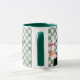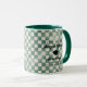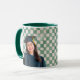 Personalized portrait mug for a graduation with a green checkered pattern on the background and the class, the graduate's name, degree, university name, and a grad cap design on the back. To create a cut-out, crop your image to the desired subject and use the "remove background" tool.