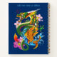 Ein grüner chinesischer Drache mit einem Orangen Koi Fisch mit Lotus-Blume und Kirschblüten vor einem Hintergrund dunkelblauer