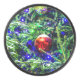 Grüner Weihnachtsbaum, blaue dekorative Lichter und roter Zierkugel mit frischem Schnee. Fröhliche und fröhliche Stimmung. Frohe Weihnachten und glückliches Neues Jahr. Drucke und Geschenke für jeden zum Spaß und gute Laune. Produkte und Souvenirs im runden Seitenverhältnis.