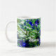 Grüner Weihnachtsbaum, blaue dekorative Lichter und roter Zierkugel mit frischem Schnee. Fröhliche und fröhliche Stimmung. Frohe Weihnachten und glückliches Neues Jahr. Drucke und Geschenke für jeden zum Spaß und gute Laune. Kaffee-Tasse. Sie können den Template-Text ändern oder löschen Frohe Weihnachten.