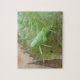 Dieses phantastische Rätsel zeigt ein detailliertes Foto einer grünen Wiege, die auf dem Blatt einer Sonnenblume sitzt. Das Foto wurde mit Makrofotografie gemacht, um dieses faszinierende Insekt und seine Umgebung im Detail zu zeigen.