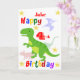 Eine lustige 4. Geburtstagskarte. Diese helle dritte Geburtstagskarte bietet einen Cartoon grünen T-Rex Dinosaurier, Pterodactyl, Brontosaurus und einen Triceratops, gelbe Sterne und einen farbenfrohen Happy Birthday Text. Ein niedliches Design für jemanden, der vier Jahre alt sein wird. Das Geburtstagsalter und der Name des Kindes auf der Vorderseite der Karte können so geändert werden, dass sie für den speziellen Jungen oder Mädchen angepasst werden. Die Nachricht im Inneren kann auch geändert werden, um sie zu personalisieren.