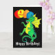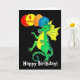 Eine farbenfrohe Geburtstagskarte für einen 4-Jährigen mit einem grünen und gelben Drachen, der Ballons auf schwarzem Hintergrund trägt, aus einem Aquarellbild von Judy Adamson. Der Gruß auf der Vorderseite ist "Happy Birthday" in weißer Schrift, und das Innere ist leer für Ihre eigene Nachricht verlassen.
