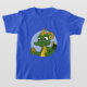 Kinder T - Shirt mit einer Abbildung von Kopf eines niedlichen kleinen grünen Drachen mit einem goldenen Ei, Design in Bluecircle, niedliche Fantasie / Märchen Design für Kinder von Maxiharmony