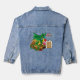 Ein kleiner grüner Drache sitzt auf einem Holzbrett auf einem Küchentisch. Gebackene Produkte wie Kekse, Muffins und Kuchen sind rund um den grünen Küchendrachen.