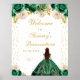 Dieses elegante und glamouröse Quinceañera Geburtstagsparty-Begrüßungszeichen besticht durch eine schöne Prinzessin mit dunklem Haar in einem Tiara und grünem Ballkleid. Der Text kombiniert handgeschriebene Skripte mit modernen serifenlosen Schriftart für ein elegantes und raffiniertes Aussehen. Die Blumenarrangements, Schmetterlinge und Goldkonfetti bilden die perfekte Mischung aus rustikal und schick. Grafiken von www.etsy.com/uk/shop/SunflowerDayLove