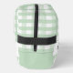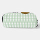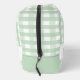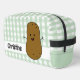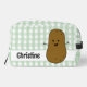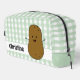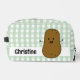 Bewundernswerte Kosmetiktüte mit einer niedlichen Cartoon braunen Kartoffel. Der Hintergrund ist ein niedliches klassisches Muster von Gingham in Grün und Weiß. Eine Vorlage, um Ihren Namen zu personalisieren.
