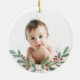 Baby Baptism Foto - Dieses Design zeigt eine Darstellung des grünen und goldenen Blattwerks, der roten Beeren im Aquarellstil. Auf der Rückseite - Sie können Ihr Foto platzieren