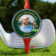 This cool customized high school golf team photo gift features gold typography of your golfer name on a Christmas ornament with a cute golfing icon on a dark green background. Personalize with your student's photograph and class year as a proud sports parent.