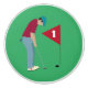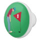 Grüner personalisierter Golfer, mit einer Kappe, tiefrotes Shirt und blaue Hose, wobei ein Golfball in einen Löchenknopf gelegt wird. Anpassen des Texts