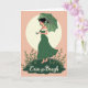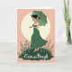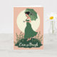 This design shows a graceful woman in profile, stepping forward as if she’s headed toward someone just out of frame, with a tender, faraway look on her face. She wears a long forest‑green gown with an off‑the‑shoulder neckline, and her dark hair is neatly arranged above softly blushed cheeks and defined lips. In her raised hand, a matching green umbrella opens overhead, decorated with fine leaf-and-flower patterns that feel like a quiet promise of shelter 💚. Behind her, a large cream circle glows like a calm moon, set against a dusty rose background that warms the whole scene. She walks barefoot over rounded, textured green hills dotted with small stylized plants, adding a gentle, intimate closeness to the outdoors ☘️. The phrase “Erin go Bragh” sits along the bottom in green lettering, centered and easy to spot against the lighter ground. The umbrella’s curved handle and the subtle botanical motifs stand out crisply against the cream circle and the rose sky.