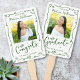 Stay cool while supporting your favorite grad as they receive their diploma with this quirky, whimsical, simple, modern keepsake 2 photo hand fan. Fun hunter green handwritten script typography and hand drawn graduation icon sketch doodles overlay a clean, minimalist white background. The copy “congrats” and photo 1 are on the front, the word “graduate” and photo 2 are on the back. Personalize the custom text with your graduate’s name, school and class year. Matching invites, thank you cards, stickers, banners, yard signs and other graduation goodies are also available in this trendy and playful collection. Guaranteed to preserve cherished memories of their special occasion!