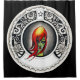 Gotische Jugendstilfrau. Fantasie, abstrakter, magischer Surrealismus im Tätowierungsstil. Hergestellt mit Prisma farbenen Stiften und Mikrokeramik. Rotes Kaminfeuer mit fett schwarz und grün in einem Kreis zeichnend Motiv.