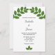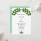 Eleganter grüner Laurel verlasse auf weißer Einladung zur Hochzeit. Auf der Rückseite des Hotels befinden sich drei Bucht-Blätter auf einem hellgrünen Hintergrund. Grün verlasse Einladungskarten.