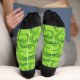 Grüne Eidechsen mit Holzschnitt-Schattierung. Nahtloses Muster. Benutzerdefinierte Hintergrundfarbe. Benutzerdefinierte Farbe des oberen Streifens. Benutzerdefinierter Text auf jeder Socke.