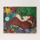 Der grüne Mann und ein Abra hhaariger Elf in einer Blumenlandschaft.