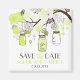 Eine niedliche und skurrile Illustration von grünen Maurerkirschen, Livebirden, Blume und Herzsaiten, die alle an Baumzweigen gekrönt sind. Diese lustige und romantische speichern Sie das Datum Magnet ist perfekt für eine Sommer-oder Frühling Hochzeit.