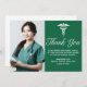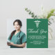 A custom photograph medical school graduation thank you card in classic green and white for a college or university from the class of 2024. Customize with your school name and graduating class under the caduceus and calligraphy for an elegant personalized graduate photo card of thanks with your senior portrait.