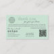 Grün Minimalistischer und moderner Script QR Code Vielen Dank, dass Sie eine Visitenkarte haben. Fügen Sie diese stilvolle Dankeschön-Karte zu Ihren Kundenbestellungen für eine warme Touch hinzu. Zeigen Sie Ihre Wertschätzung und hellen Sie Ihre Verpackung mit einem weichen grünen Design und modernen Schriften. Personalisieren Sie es, indem Sie einen speziellen Gutscheincode einschließen, um zu wiederholten Käufen zu ermutigen. Fügen Sie Ihr Logo und Social Media-Profile hinzu, um den Kunden zu helfen, eine Verbindung bleibe. Fügen Sie Ihren Webseitenlink in den QR-Code ein, um den Zugriff zu erleichtern. Helfen Sie dabei, starke Beziehungen für Ihre Kunden aufzubauen und Ihre Marke unvergesslich zu machen.