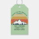 Coole Wiedersehen-Gastgeschenk-Tags für eine Herbsthütte oder ein Treffen im Freien mit Cousins, Tanten, Onkeln und Großeltern. Laden Sie die ganze Crew mit Ihrem Nachnamen und Jahr in Grün ein, um das wunderschöne Sonnenuntergang über Bergen und Bäumen zu umgeben. Große personalisierte Gruppe Camping Reise Geschenke Tags.