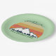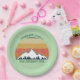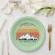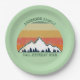 Coole Wiedersehen-Papier-Teller für eine Herbstkabine oder ein Outdoor-Treffen mit Cousins, Tanten, Onkeln und Großeltern. Laden Sie die ganze Crew mit Ihrem Nachnamen und Jahr in Grün ein, um das wunderschöne Sonnenuntergang über Bergen und Bäumen zu umgeben. Große personalisierte Gruppe Camping Reise Party Platte.