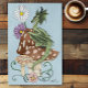 Ein kleiner grüner Drache sitzt auf einem von drei Pilzen mit Blume, umgeben von blauen