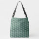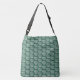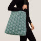 Ladys große Crossbody Beutel in einem Muster von weißen Kreisen, mit grüner Einmischung. Ein wiederholtes Muster von hellen kreisförmigen Kreisen erzeugt eine starke Designanweisung. Die Farben sind grün und weiß.