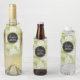 Die Hochzeitsflasche hängt mit einem sich wiederholenden Muster großer Blätter aus Palmen auf einem Olivenhain. Moderne und tropische Atmosphäre. Ein schwarzer Kreis mit goldfarbenem Innenrand überlagert mit personalisierten Details innen.