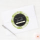 Küchenetiketten mit einem sich wiederholenden Muster großer Palmen-Blätter auf einem olivengrünen Hintergrund. Moderne und tropische Atmosphäre. Ein schwarzer Kreis mit goldfarbenem Innenrand überlagert mit personalisierten Details innen.